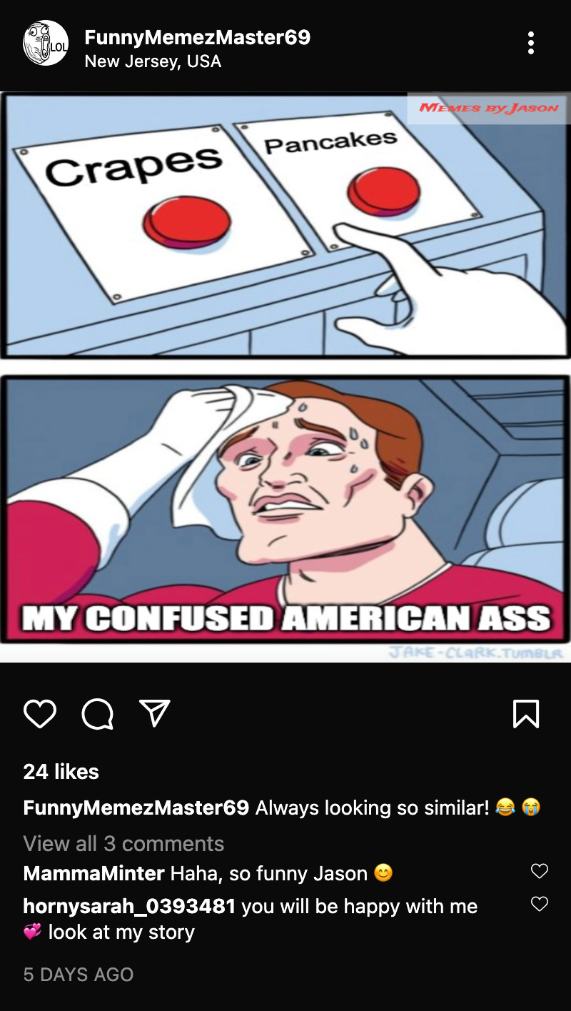This meme, which features a spelling error, two watermarks, and a faulty premise, has exploded on Jason's account. The meme has 24 likes and 3 comments, all of which are lauding Jason for his humorous take on the non-existent conundrum that is telling apart packages and crepes. Luckily for Jason, he can rest assured knowing that no one can steal his meme without being held accountable by his watermark.