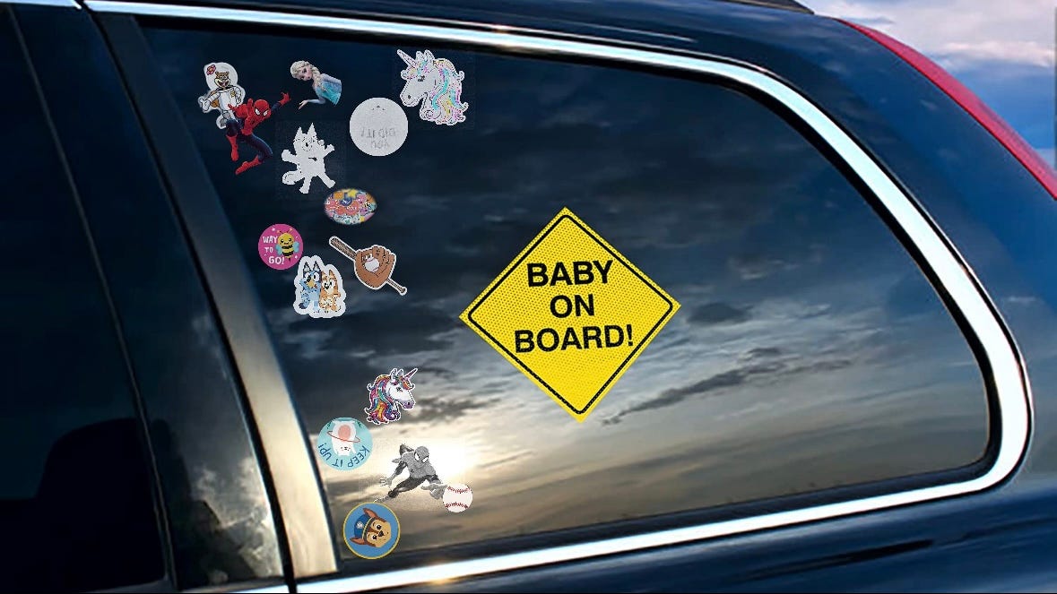 A minivan on the highway wants other drivers to take extra care around them, signaling this with a “Baby on Board!” decal.