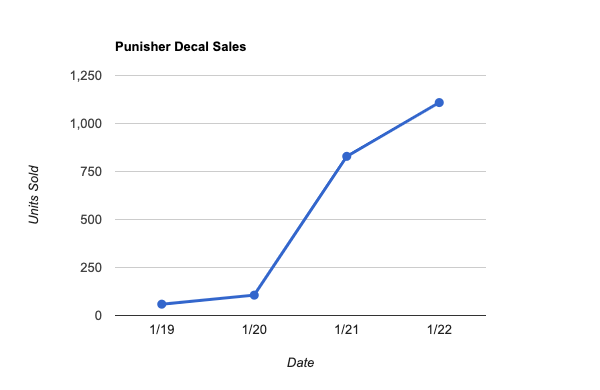 As these criminals returned home to their annoyed families, a curious economic trend started to appear: sales for Punisher car decals began to soar.