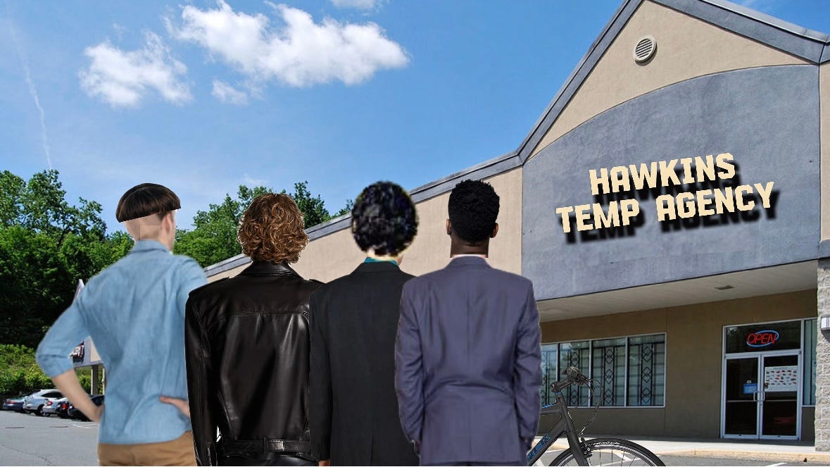 In one scene in the trailer we see the group appearing to leave a fight with the Demogorgons early to make their appointment at the Hawkins Temp Agency.
